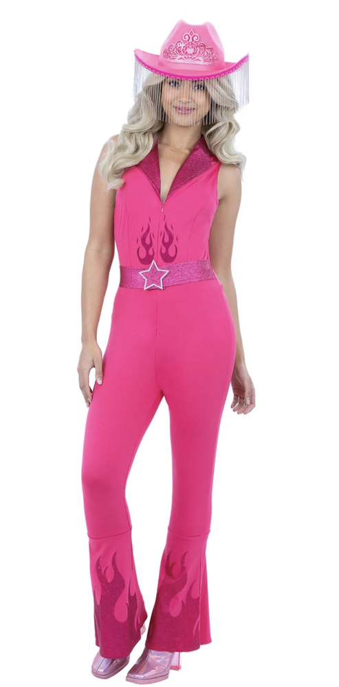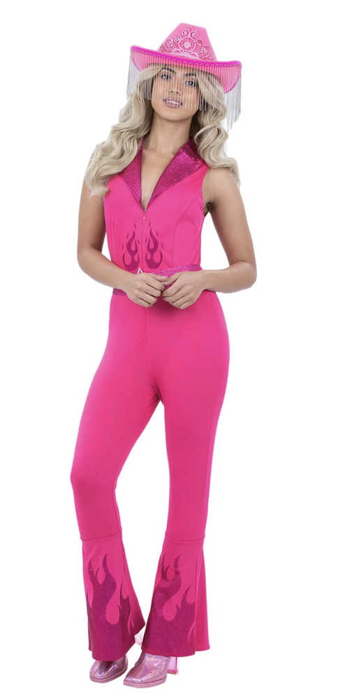 Stand out in the Pink Glamorous Cowgirl Costume — a head-to-toe hot-pink jumpsuit with glitter trims, flame detailing and a fringe‑trimmed cowgirl hat. The sleeveless, zip‑front design and flared legs create a retro‑glam silhouette that’s perfect for fancy dress nights, hens celebrations and Halloween parties. Available for pickup in Perth.