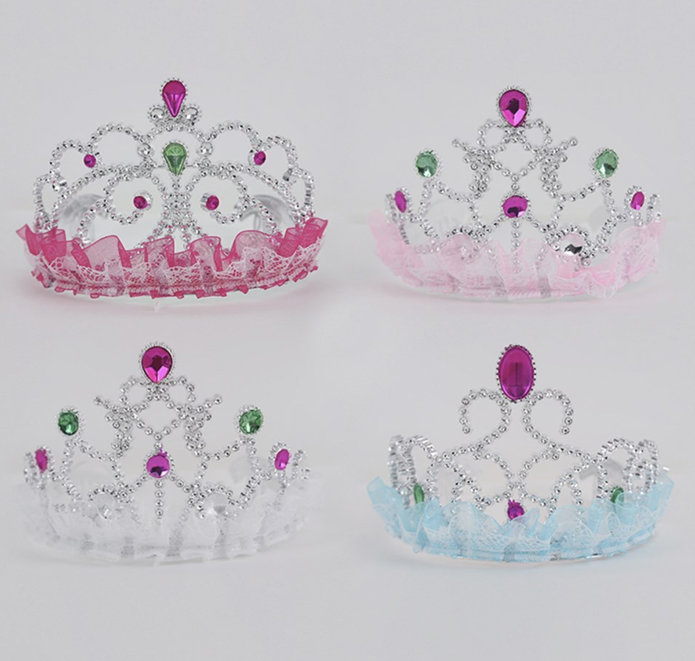 • Colour / Design: Silver rhinestone-style frame with pink, white or blue ruffled trim and coloured gem centres