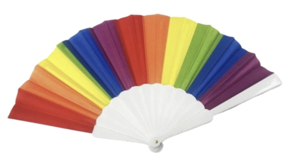 • Colour / Design: Vivid rainbow stripes on a pleated fan