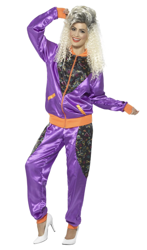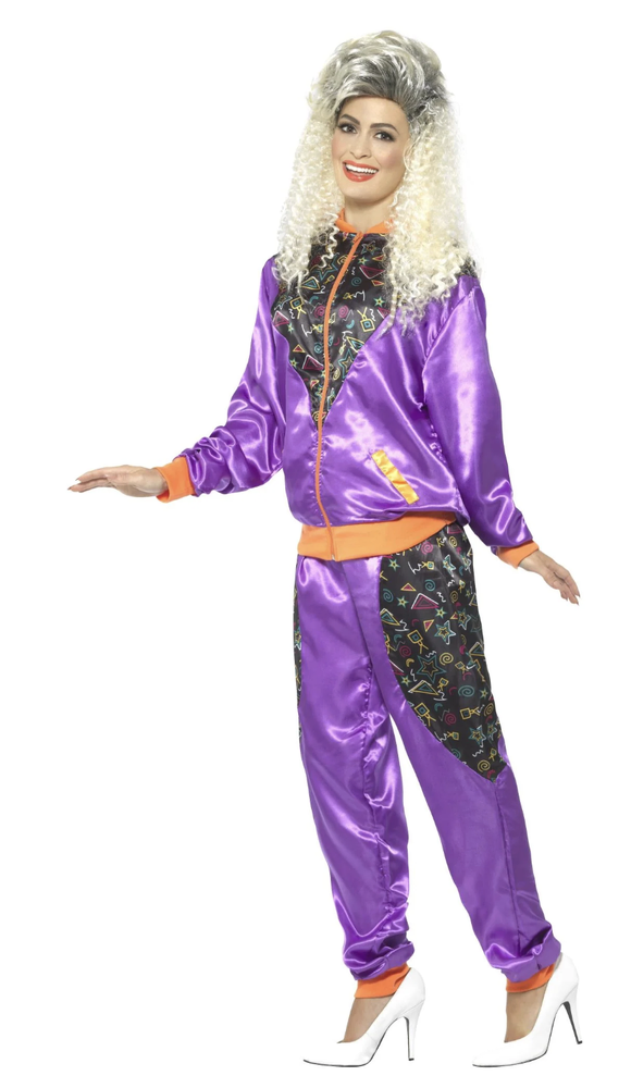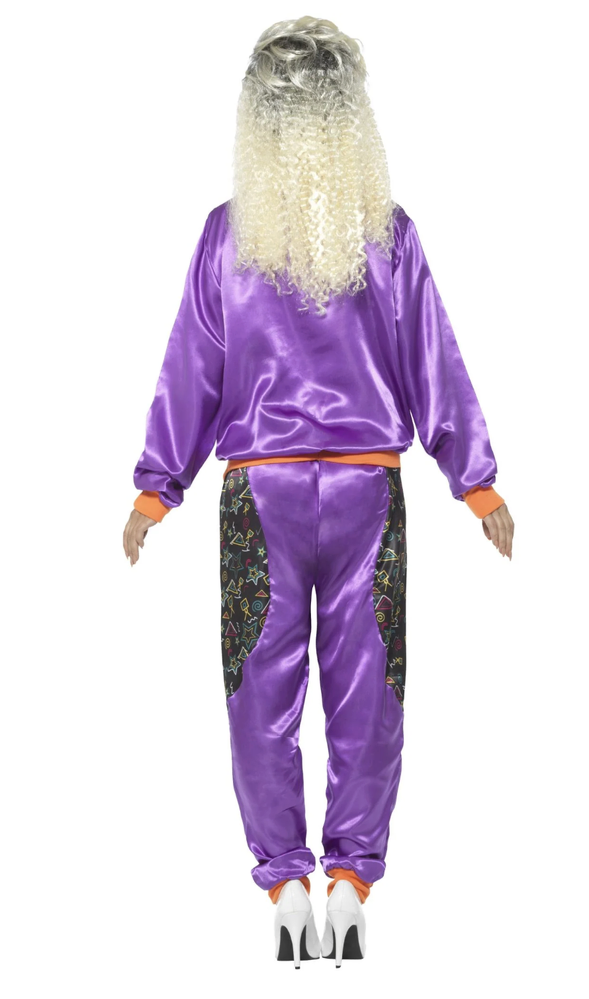 This retro shell suit guarantees you'll be the loudest look at any '80s party or Halloween bash. The vivid purple, neon geometric panels and bright orange trims recreate authentic athleisure attitude — a zip-up jacket and matching pants with elastic cuffs for the relaxed silhouette. Perfect for slipping on and hitting the dance floor.