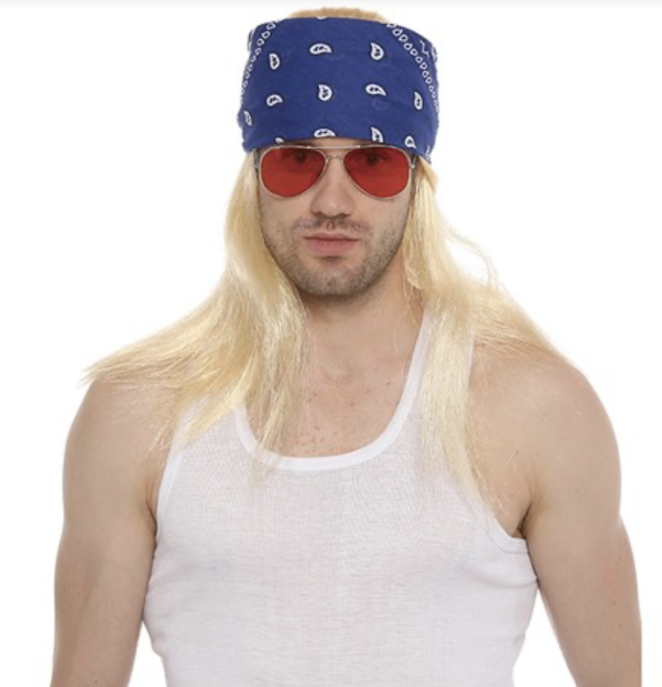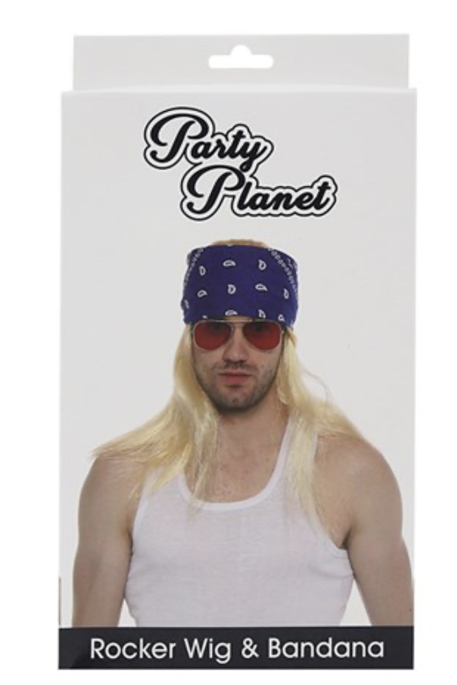 Turn heads with this Rocker Wig & Bandana — the easy way to nail an ’80s rock look for fancy dress or Halloween. The one-size piece fits most adults and combines long, straight blonde hair with a sewn-on blue paisley bandana for instant authenticity. Lightweight and ready to wear; perfect for theme parties or last-minute costume runs. Pickup in Perth or postage Australia-wide.