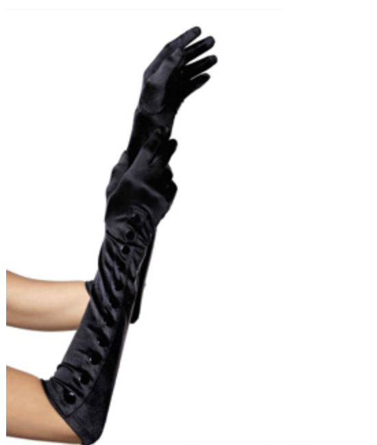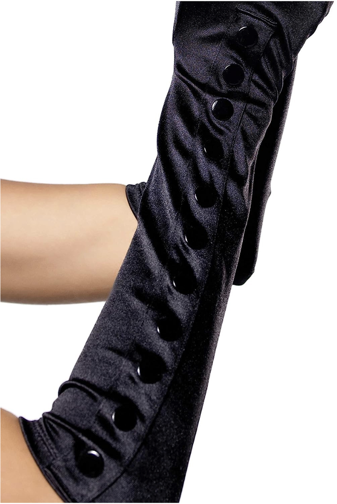 Slip into instant glamour with these classic black satin elbow-length gloves — the perfect finishing touch for vintage, Gatsby or Hollywood-inspired looks. One size (O/S) fits most adults. The smooth satin sheen and neat row of snap buttons up the forearm add dramatic detail for formal events, burlesque or Halloween costumes. Pickup in Perth available for same-day collection.