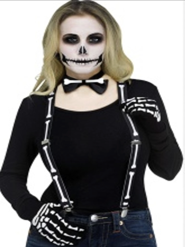 • Includes: Skeleton suspenders, skeleton gloves, bow tie