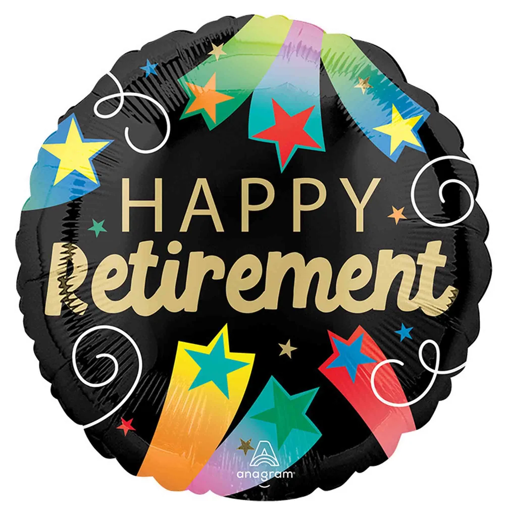 Celebrate the retiree in style with this glossy foil "Happy Retirement" balloon — a bold black backdrop with gold lettering and bright multicoloured stars that catch the eye and photograph beautifully. One size (approx 40 cm) and sold as a single balloon, it’s a simple, striking finishing touch for retirement parties and workplace send-offs. Pickup in Perth available.