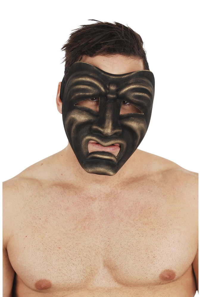 Bring classical drama to any costume event with this Tragedy Gold Face Mask. The deeply sculpted frown and antique-gold highlights catch the light for a striking, theatrical look that gets noticed. One size fits most adults with a secure elastic strap — perfect for theatre productions, masquerades or Halloween parties. Lightweight design stays comfortable for hours.