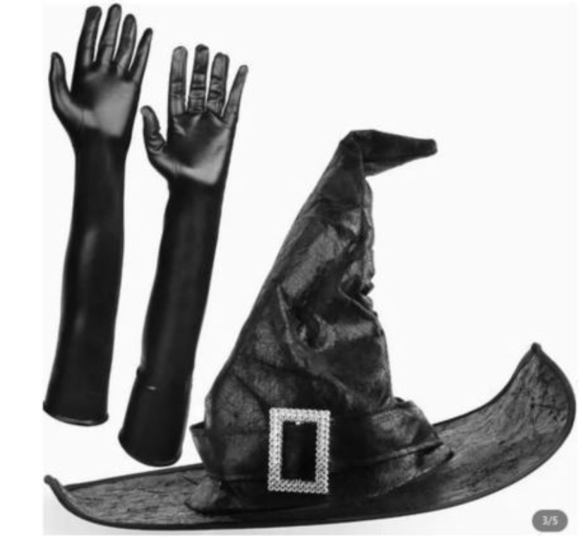 • Includes: Pointed witch hat, long elbow/forearm-length gloves